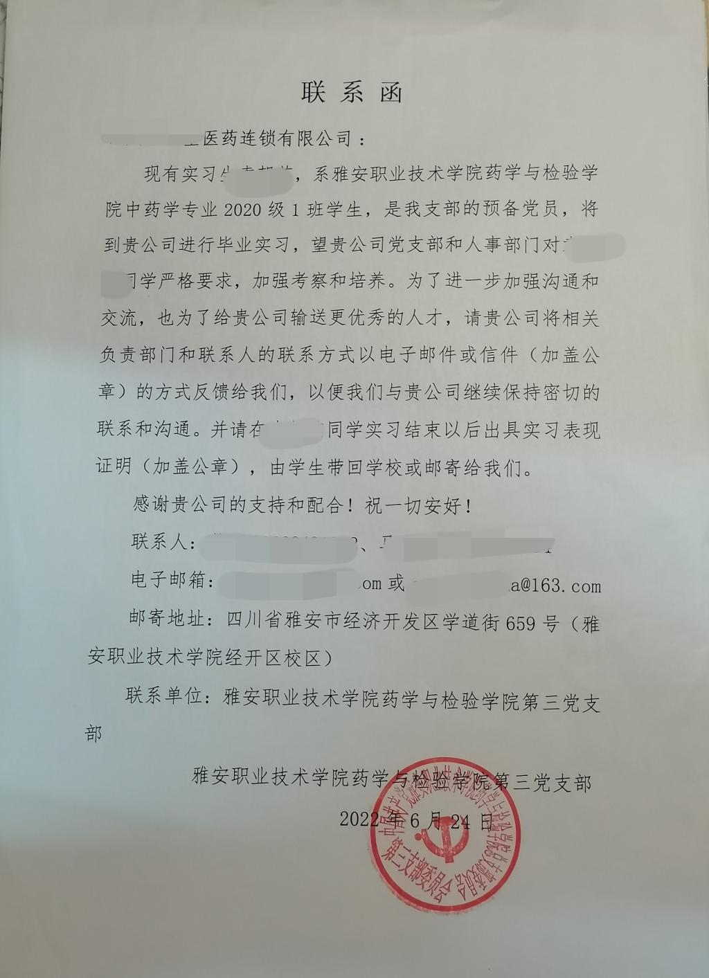 联系函中,公司第三党支部向用人单位告知员工预备党员和入党积极分子的培养阶段,希望用人单位党组织对实习员工预备党员和入党积极分子严格要求,加强考察和培养,并请用人单位对党组织的联系方式进行反馈,通过加强校企共建,严把员工党员教育关和发展关。