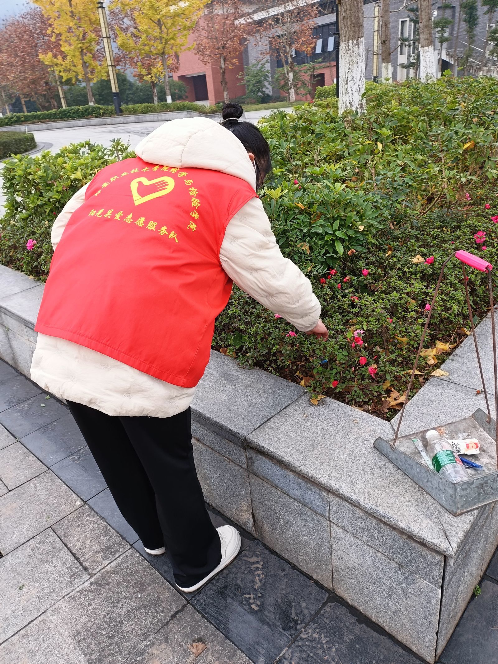 为更好的开展本次活动,在活动开始前,志愿者们首先在2103教室集合,分发志愿服,统一活动着装,并告知本次活动的目的意义和具体行动内容。活动中志愿者们认真的清洁校园,小到花丛中不起眼的烟头杂物,再到路边随意丢弃的纸巾矿泉水瓶等,都“逃不过”志愿者们勤劳的双手。作为雅职学子,大家既是雅安创建全国文明城市的参与者、实践者,更是共享者、受益者,每个人都有责任和义务为创城尽一份心,出一把力。