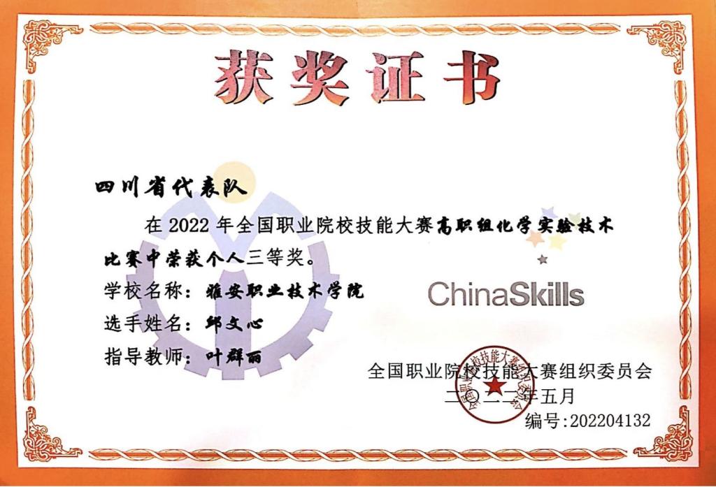 8月15日至16日,教育部主办的2022年全国职业院校技能大赛(高职组)化学实验技术赛项在潍坊职业公司举行,来自全国56所院校的56名选手参赛。公司太阳集团tyc46332020级药学专业员工邱文心作为四川省代表队选手之一参加比赛,经过两天三个子赛项的激烈角逐,最终斩获三等奖,为四川省在2022年国赛上再添一奖!