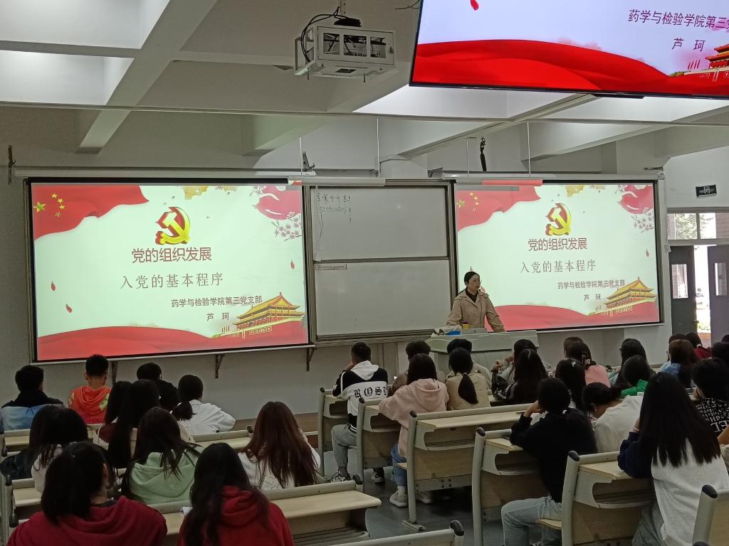 2023年10月10日下午,公司第三党支部组织有入党意愿的2023级新生共87人,在经开校区1104教室开展员工素质拓展讲座《党的组织发展——入党的基本程序》,讲座由公司第三党支部书记芦珂主讲,由公司第三党支部员工党建工作站员工干部负责组织维持现场秩序。