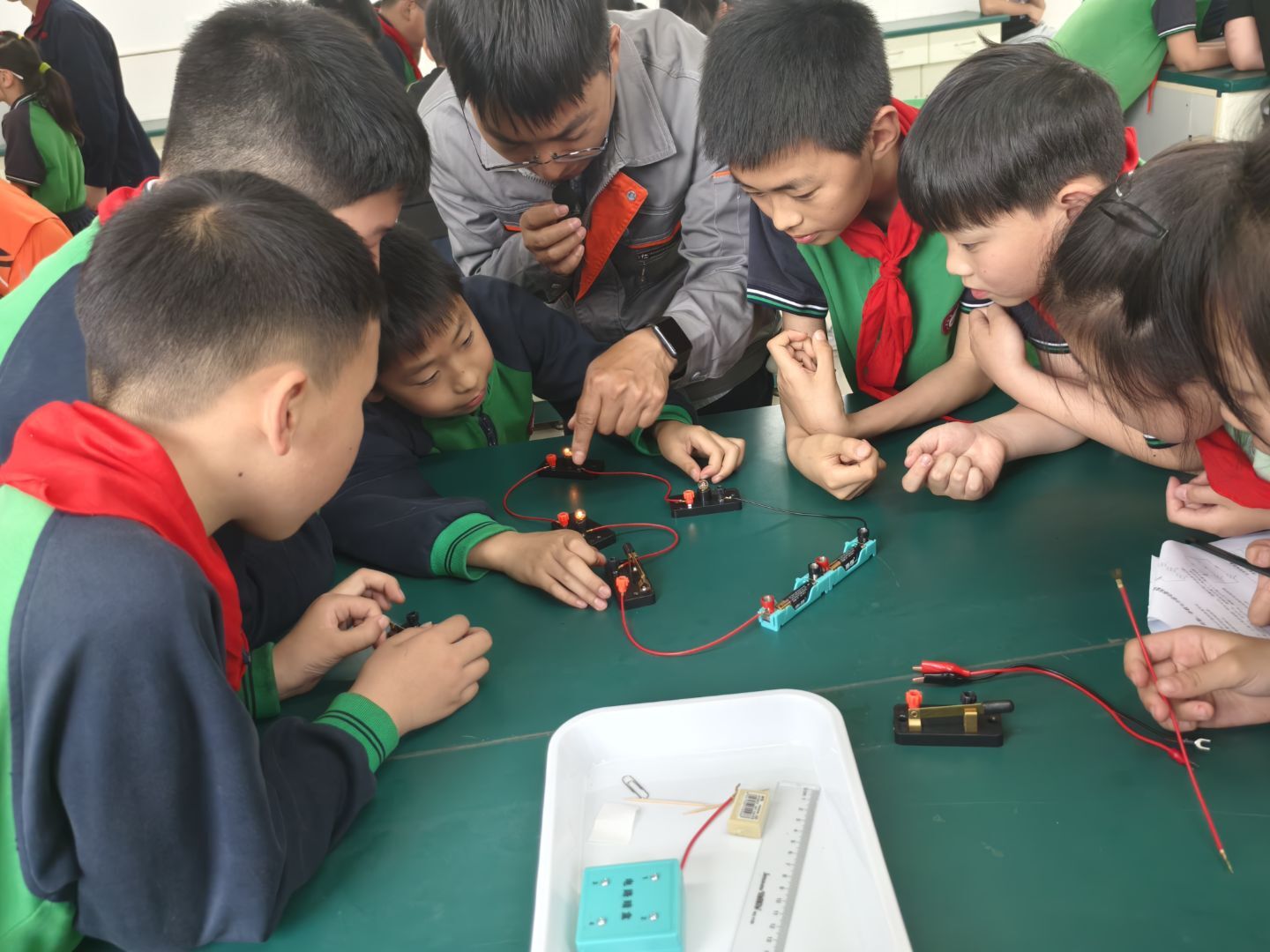 活动中,小员工们充满好奇心,兴奋不已,积极参与,在老师和老员工助教的指导下,他们能够分组合作,顺利操作实验步骤,记录实验现象与结果,理解到电路知识点。老员工们通过助教角色,沟通表达能力、组织领导能力、应急能力等得到锻炼,社会责任感和自信心得到提升。