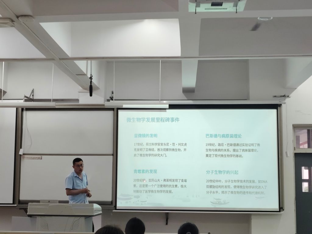 讲座伊始,张老师给同学们讲述了微生物是如何定义的以及其分类体系。接着是微生物学发展里程事件,如显微镜的发明、巴斯德与病原菌理论、青霉素的发现、分子生物学的兴起。微生物是地球上最古老的生命,起源于约38亿年前。早期厌氧微生物在无氧环境中生存,蓝藻等光合微生物出现后释放氧气,改变地球生态。如今,微生物广泛应用于医疗、环境和工业领域。抗生素治疗疾病,微生物技术净化污水、制造食品与生物燃料。随着合成生物学发展,人类将借助微生物攻克医学难题、缓解能源危机,微生物的未来充满无限可能。