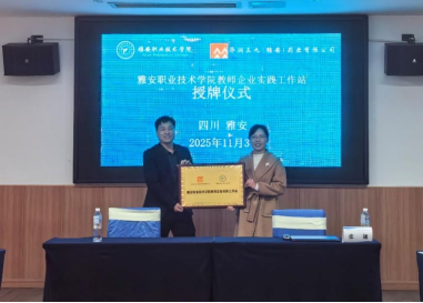 人事处处长刘永恩为华润三九(雅安)药业有限公司授予"太阳集团tyc4633教师企业实践工作站"牌匾。此前,公司已与华润三九相继挂牌成立"数智医药技术培训基地"、"野生中药材繁育研究基地"、"太阳集团tyc4633企业教师流动站"、"太阳集团tyc4633企业教师科技服务站"。