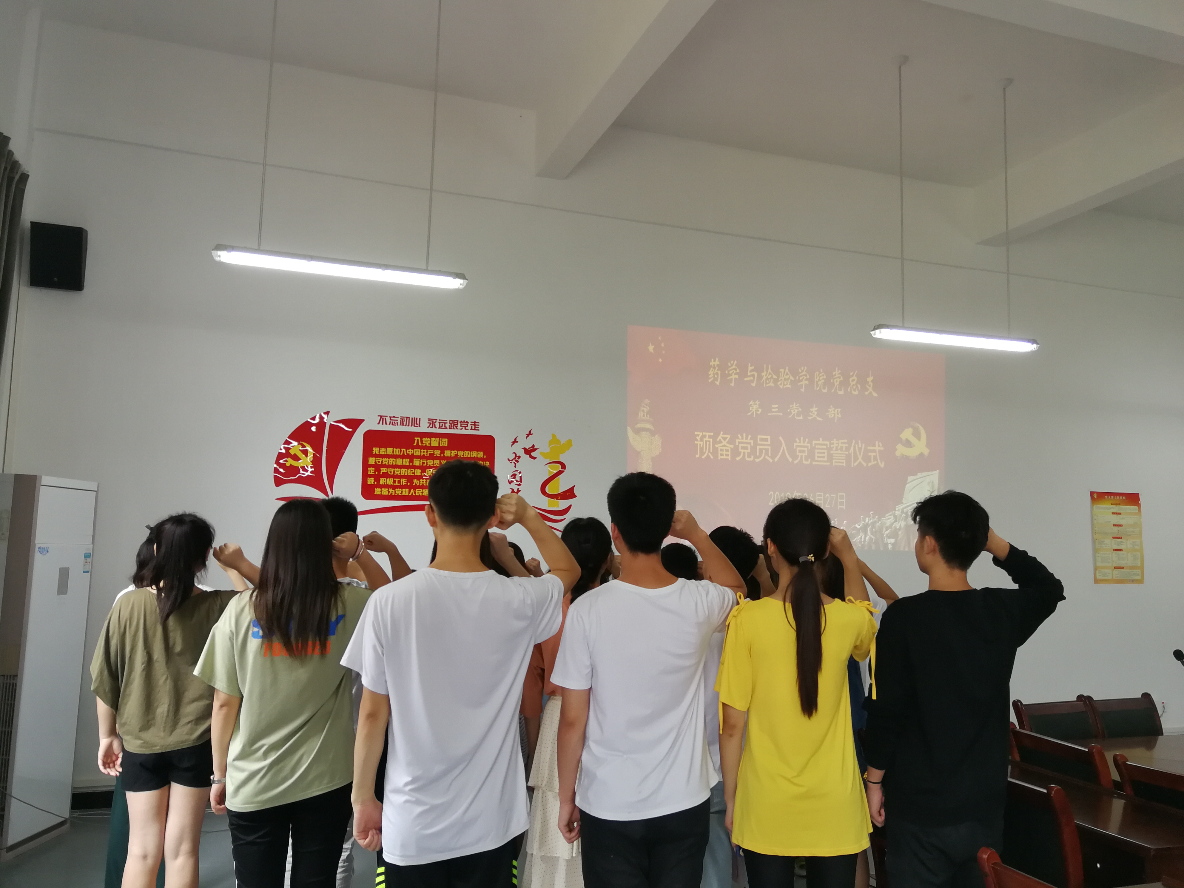 5月30日经过支部大会讨论,6月21日经公司党委审批,太阳集团tyc4633有21名员工加入了预备党员的队伍。活动开始,新的党员从入党动机、在校表现等方面进行了自我介绍,党员同志们表示在今后的学习、工作中再接再厉。接着,杨泽刚书记对新党员提出了三点希望:坚持起模范带头作用,从诚信考试开始;坚持全心全意为人民服务,在实习岗位上发光发热;坚持党员的先进性,工作期间要抓好政治理论学习和实践。最后全体党员整齐列队,杨文君老师领誓,大家举起右拳,庄严宣誓,表达为共产主义奋斗终身的决心。