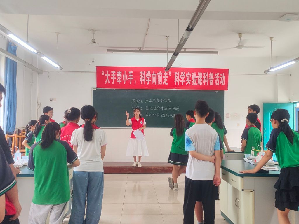 本次科普活动紧跟小学六年级科学课教学进度及时开展“产生气体的变化”实验、“发现变化中的新物质”和“变化中伴随的现象”实验。物质的变化往往伴随着一些现象的发生,如变色、发光、发热、产生气体、产生沉淀、产生气味等现象。通过观察变化中伴随的现象,寻找证据来推理是否产生了新物质,进而判断是物理变化还是化学变化。