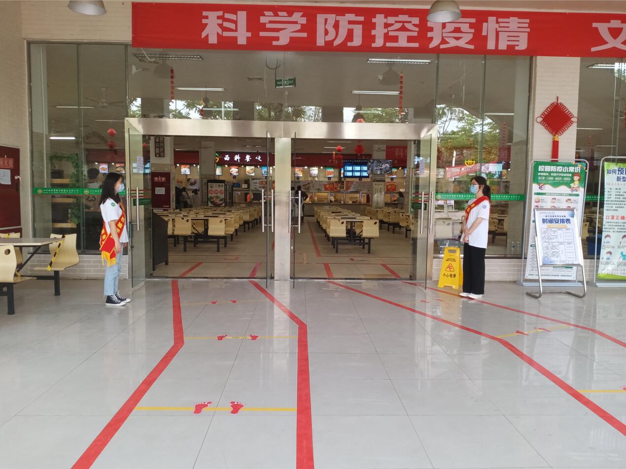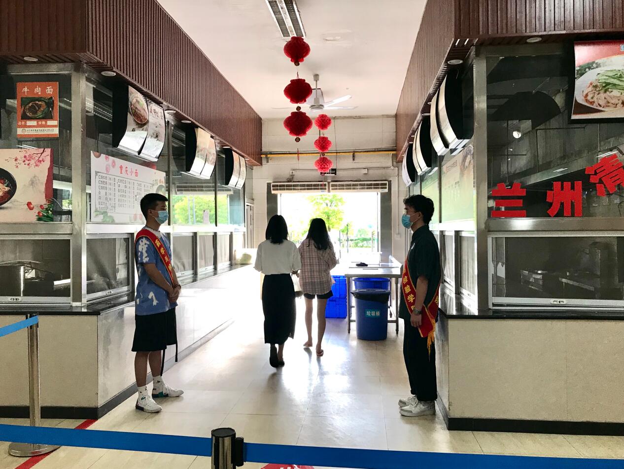 为确保同学们在校期间的有序就餐,员工分专业、分批次错峰就餐,在食堂采取“前门进,侧门出,堂食一桌一人,排队间隔1.5米,自带餐具,测体温,戴口罩”等措施,对疫情期间食堂就餐做出明确规定。20名志愿者们在值班老师的带领下,精神饱满地坚守在各自岗位中,细致地维持着就餐秩序,提醒和引导同学们文明就餐,根据食堂内的就餐入座率和排队情况,及时提醒场外志愿者组织食堂外同学排队,避免扎堆等不文明现象的发生。通过志愿者们的共同努力,为师生校园就餐筑起了一道坚实的安全防线。