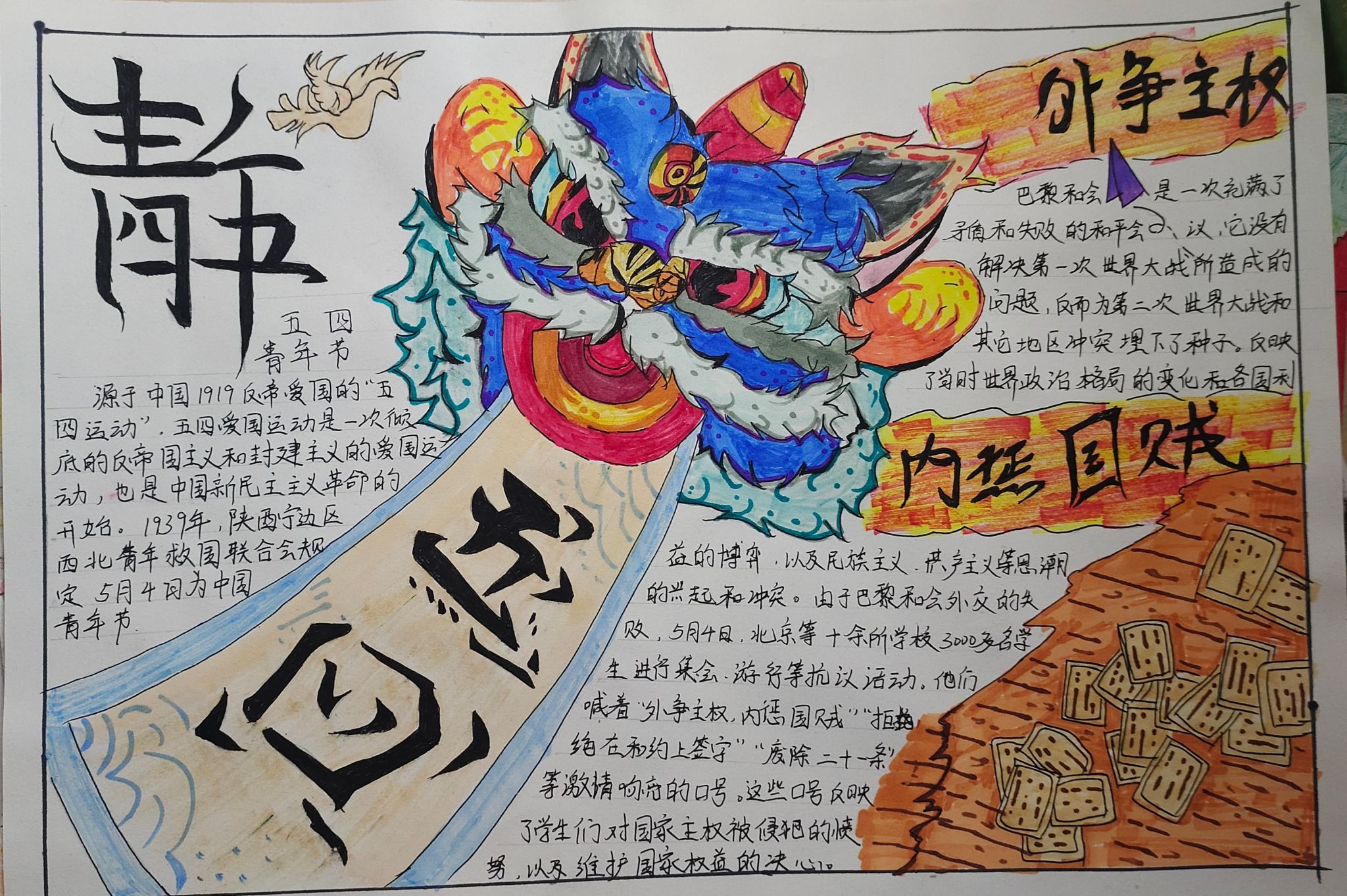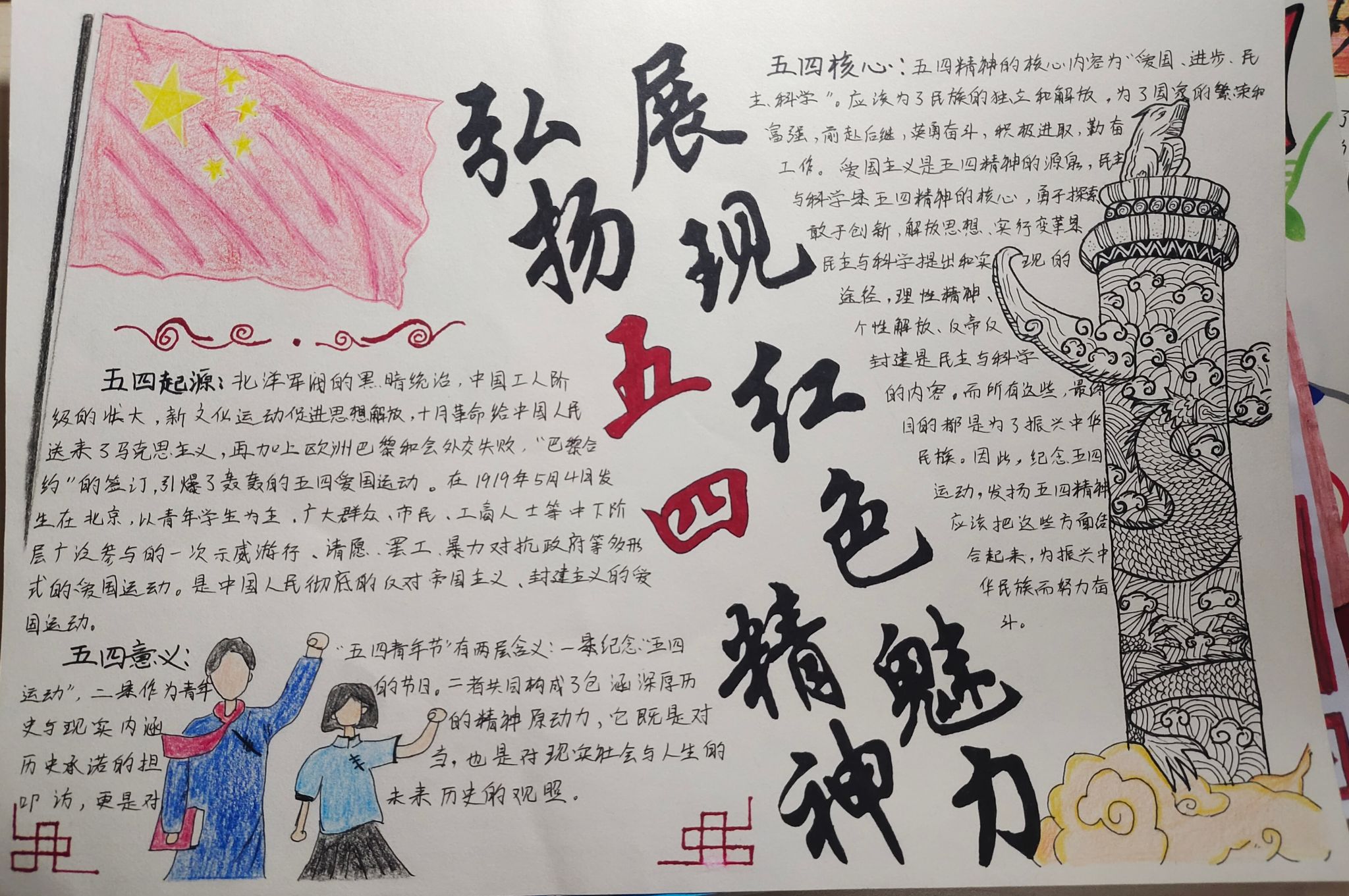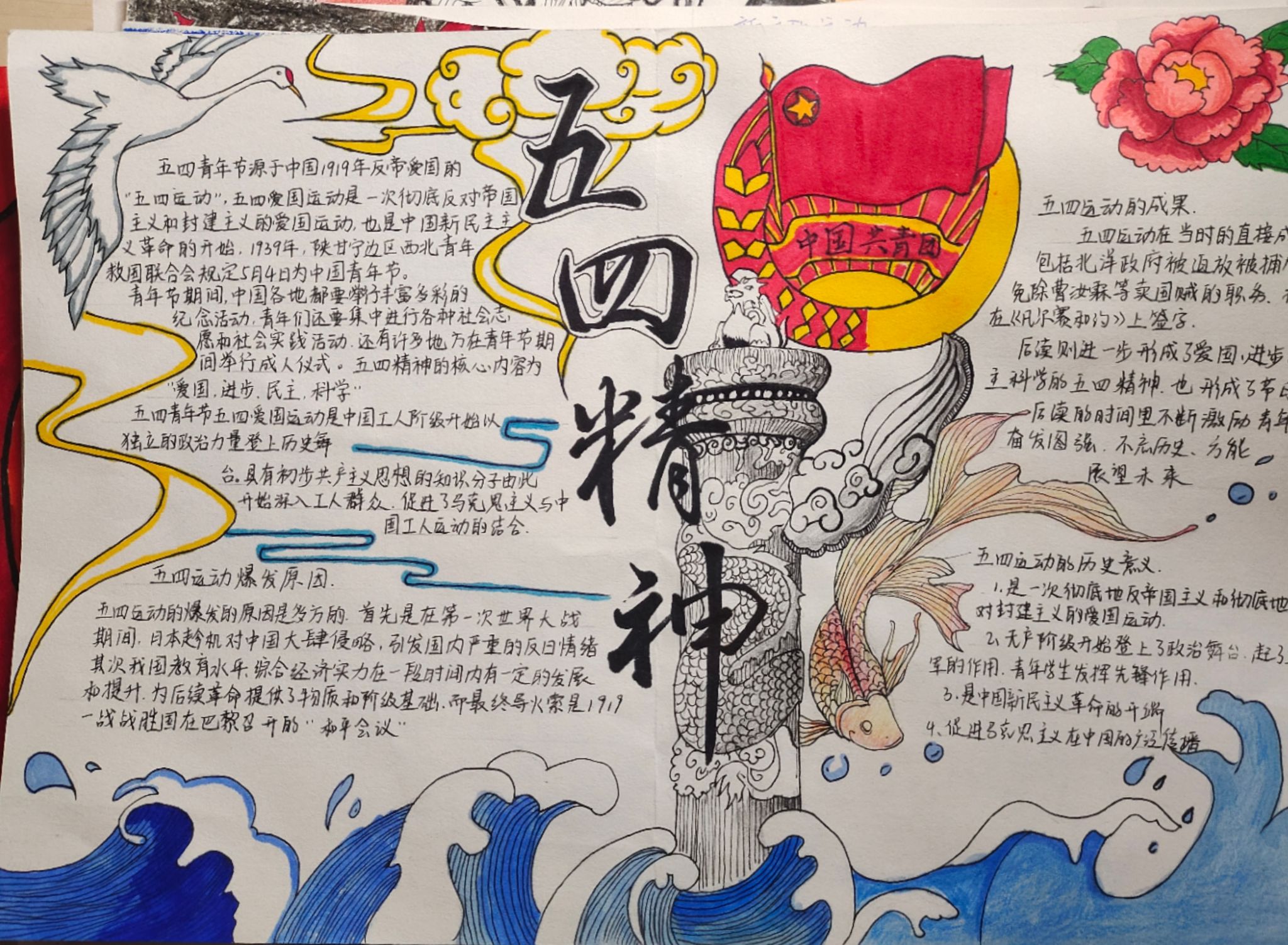 同学们通过了解,收集“五四运动”的相关资料,以手绘五四故事的形式,深入学习并感悟五四精神,坚定理想信念,树立了正确的价值观。许多作品不仅色彩丰富、图文并茂、书写美观,而且标题醒目突出,版面设计新颖独特,具有很强的观赏性与可读性。